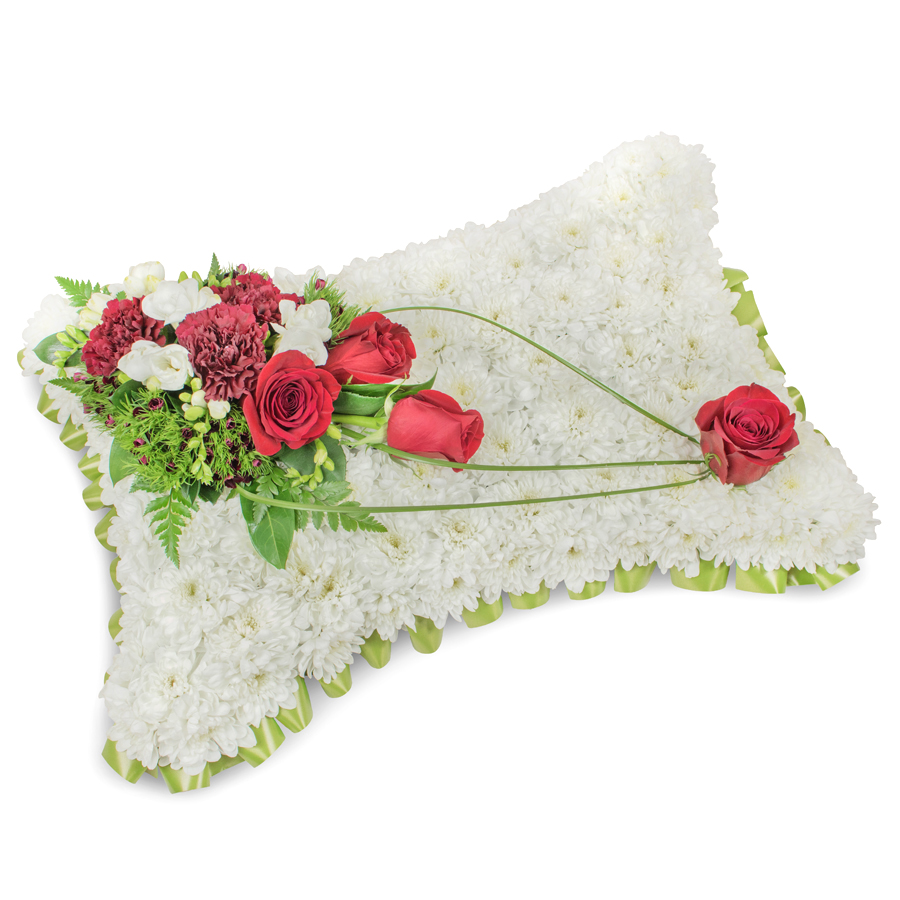 Express your condolences with our beautiful sympathy bouquet, featuring a unique blend of white chrysanthemums, red roses, white freesias, dark red carnations, dianthus, and bear grass. Each flower is hand-selected to guarantee maximum freshness and quality.