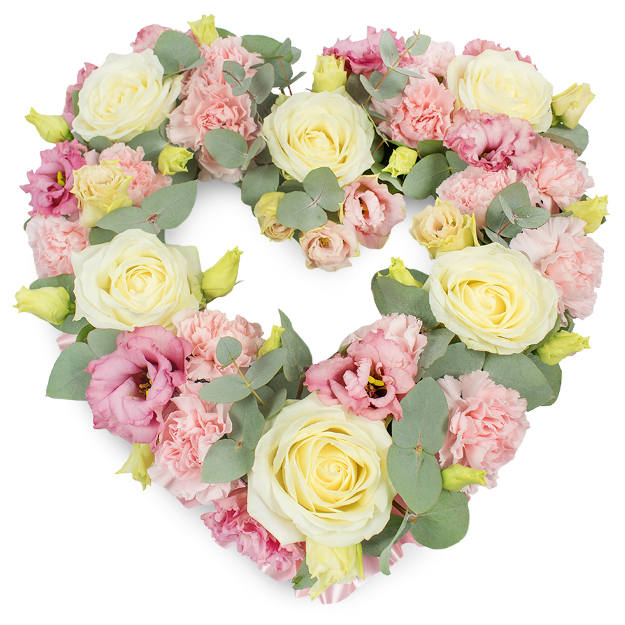 Capture your emotions with our Heartfelt Floral Tribute, an exquisite arrangement designed to honor and remember. This bouquet showcases a stunning mix of white roses, pink carnations, pink lisianthus, and fragrant eucalyptus.Features: